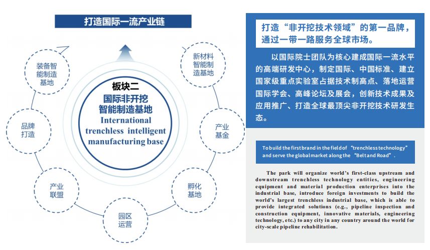 国际非开挖技术产业基地项目是由南阳市政府支持、央企参与、引进外资的方式共同成立,项 目设计总投资50亿元人民币以上。作为全球首家国际非开挖技术产业基地,项目依托全球非开挖最 顶尖团队——SamuelAriaratnam院士、王复明院士和马保松教授领衔,拟打造以国际非开挖技术研究院、国际非开挖智能制造基地、国际非开挖⼈才培育基地三大板块为主的产业生态。拟建成国国际非开挖产业集群,实现管道检测装备、管道预处理装备、非开挖管网修复主材、管道局部修复辅材、非开挖特种机器人、非开挖施⼯辅助设备、管网安全防控智能运维、管网全生命周期管理等全产业生态。